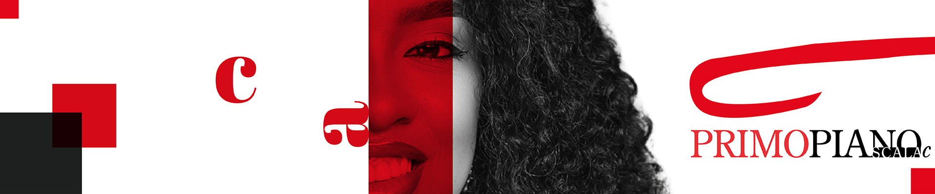 Red, black and white, these are the traditional colors of Telos A&S that you will find in the 2025 cover graphics of PRIMOPIANOSCALAc. We reveal our guest’s identity by showing half of their face on one side and a quote from the interview on the other. Their name is written in Abril Fatface, a classy font inspired by 19th-century European advertising posters.